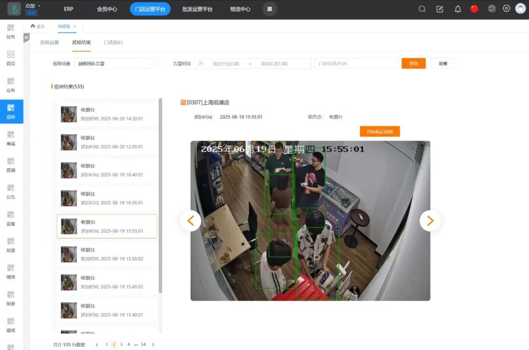 2、巡检结果直观呈现:门店运营系统基于AI场景配置识别到异常后,结果进行展示,并用绿框标注出目标对象。