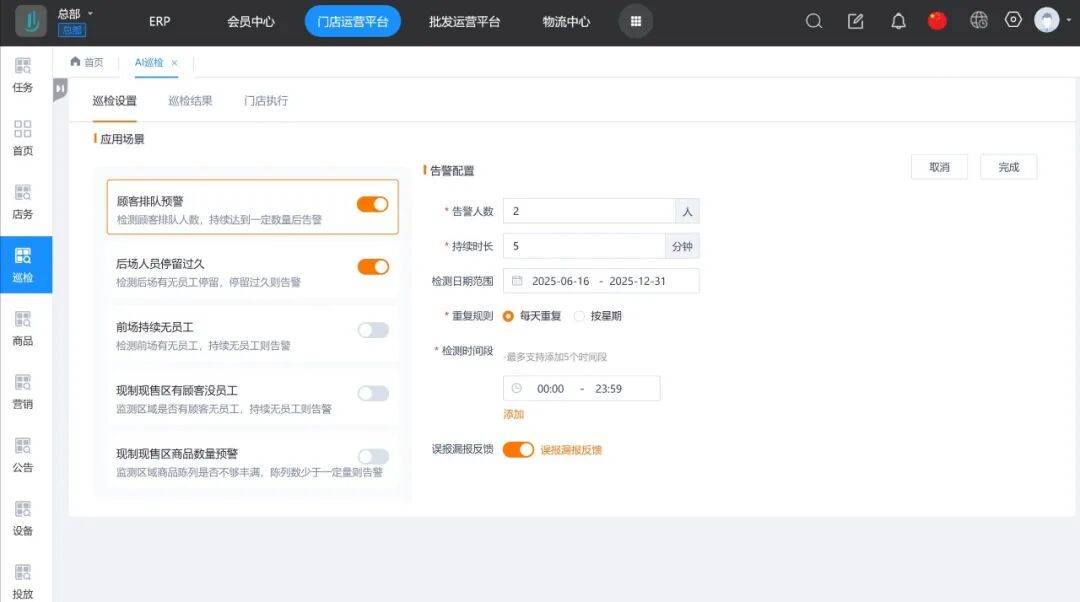 1、AI巡检场景灵活可配置:支持开启或关闭各个应用场景,针对具体应用场景,可设置检测日期范围、时间段、持续时长等。每个客户可以个性化制定参数,让系统基于规则去抓取门店的异常情况。