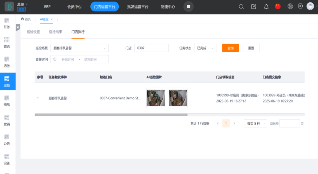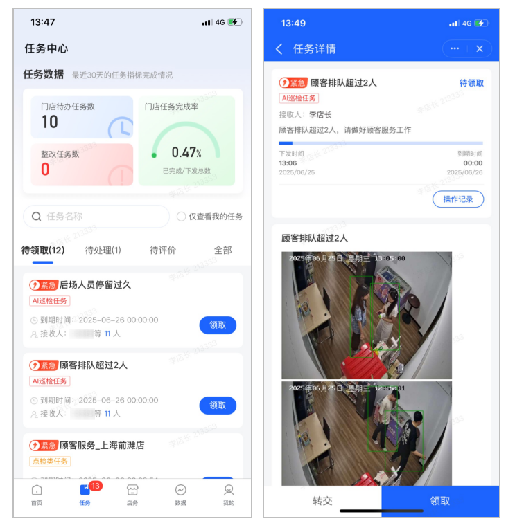 3、门店执行进度可追踪:门店人员收到AI巡检告警任务,基于场景需求进行及时处理,处理完毕后反馈门店解决情况给总部。总部在后台可以了解门店任务执行明细。